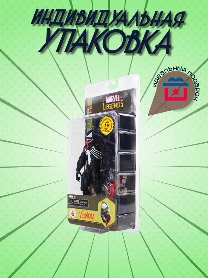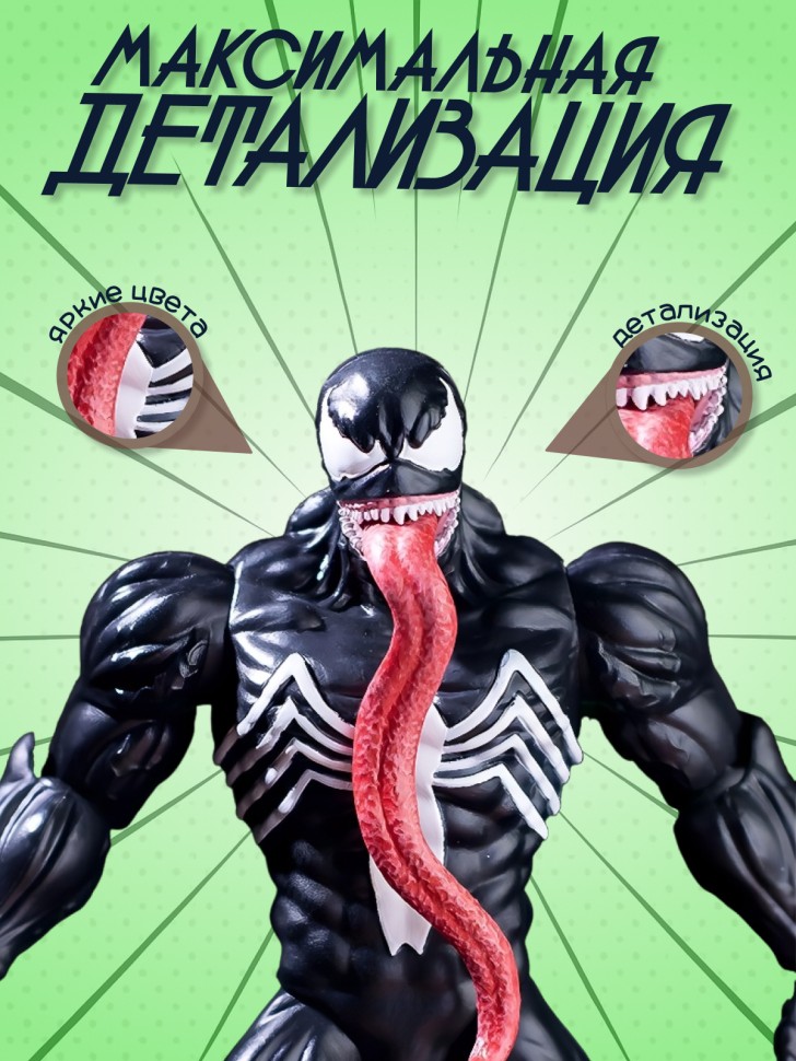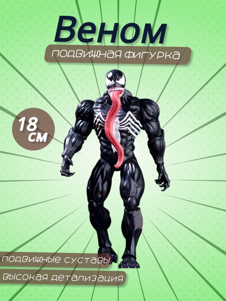 Существо инопланетного происхождения объединяясь с человеком образует Веном - главного врага Человека-паука. Фигурка олицетворяет главного героя одноименного супергеройского фильма. Подвижная фигурка размером 18 см, в наборе есть дополнительный съемный язык большего размера.