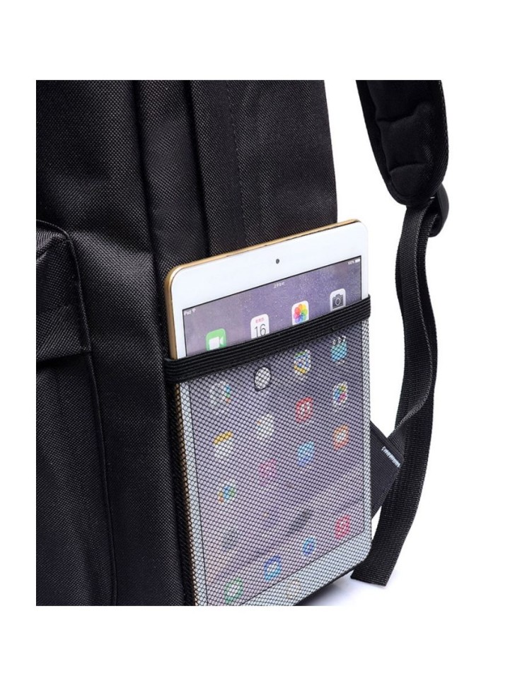 Рюкзак для школы или спорта. Легкий (всего 410 г), удобный и вместительный. Внутри и снаружи есть несколько отделений карманов, ручка для ношения в руке, вентилируемые широкие лямки и мягкая воздухопроницаемая спинка. Лямки регулируются по длине. На боковой поверхности рюкзака есть USB вход для наушников и зарядки (провода идут в комплекте). Рюкзак подойдёт для школы, учёбы, прогулок, путешествий и спорта. Объем: 35 л. Размер: 44*30*15 см. Цвет: Черный