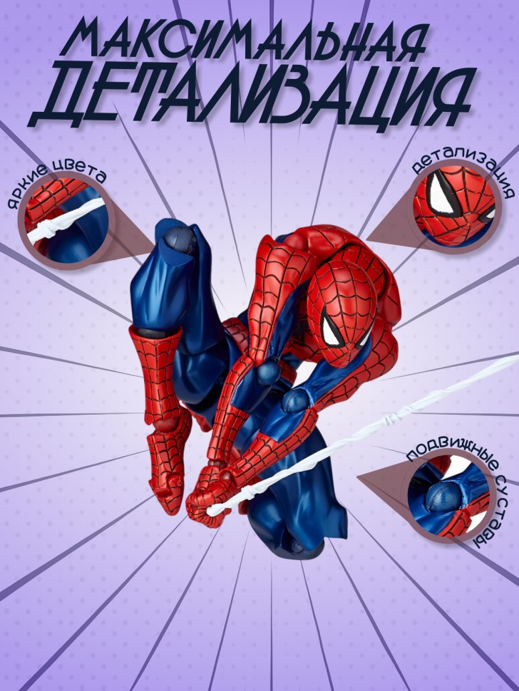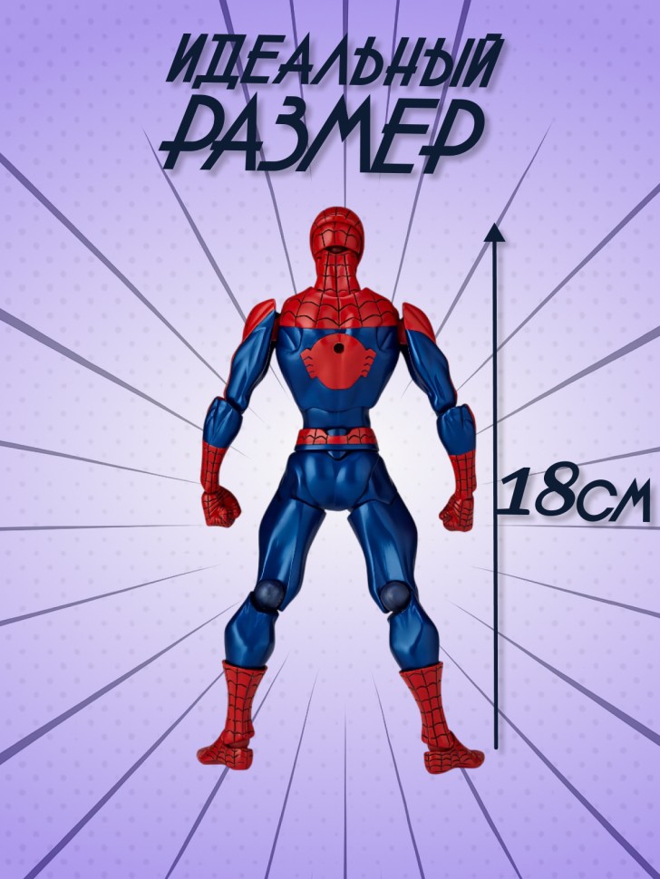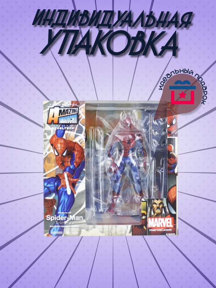 Фигурка супергероя комиксов, фильмов, а также мультфильмов и видеоигр. Обладает паукообразными способностями, его настоящее имя – Питер Паркер. Является частью кинематографической Вселенной Marvel, один из самых популярных и коммерчески успешных персонажей. Фигурка детализирована и точно повторяет знаменитый костюм Человека-паука.