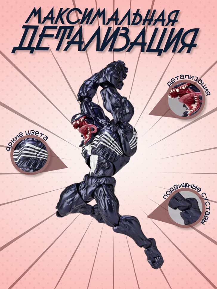 Заказывала фигурку Венома в подарок, очень понравилась коробка и оформление, создаётся впечатление, что она приехала прямиком из Японии. Фигурка увесистая, резиновая, шарниры тугие, что помогает находиться ей в одном положении, детали хорошо проработаны и аккуратно расскрашены. Качество фигурки отличное, единственный минус, у моей почти сразу отвалился большой палец на руке, шарнир не сломан, но держится не так прочно. Не смотря на это, 10 Веномов из 10.