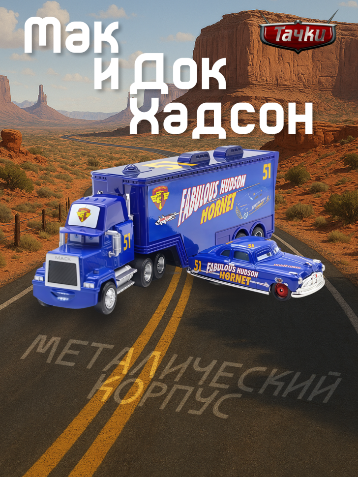 Набор машинок из мультфильма "Тачки". В наборе представлены Док Хадсон и его перевозчик. Док почти 50 лет назад подряд 3 года оставался абсолютным чемпионом Кубка Большого Поршня, пока не попал в аварию, из-за которой был вынужден завязать со спортом. Он всегда спокоен, невозмутим и строг. Размер тягача 23 см, машинки Хадсона - 8,5 см, что позволяет ей легко помещаться в прицеп перевозчика. Обе машинки выполнены из металла, прицеп - из пластика.