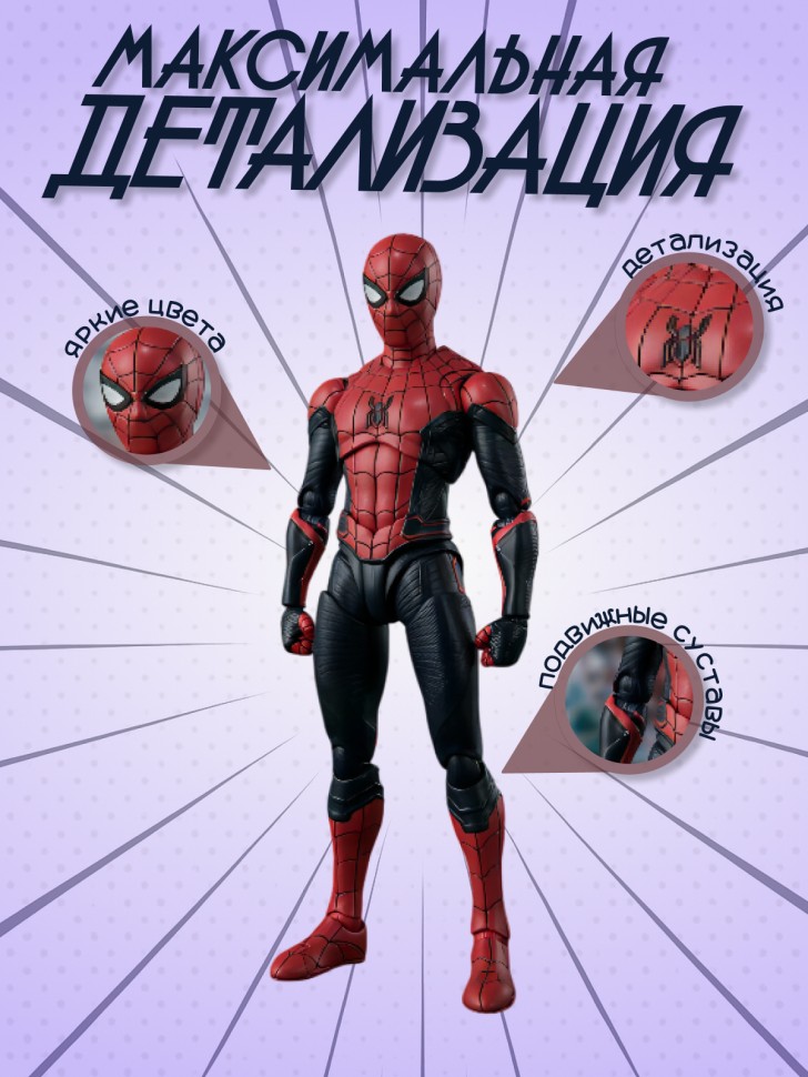 Подвижная фигурка Человека-паука известного по фильму «Человек-паук: Вдали от дома» в размере 15 см. В комплекте следующие аксессуары: 4 пары кистей, 4 вида паутины, сменные глаза 3 пары.